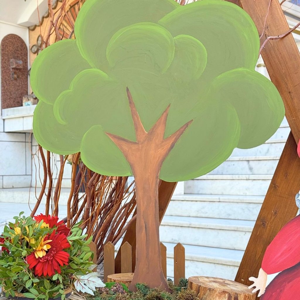 Χρωματιστά μανιτάρια σε κόκκινο και λευκό, απλωμένα πάνω σε βελούδινο, πράσινο γρασίδι, κουκουνάρια, κορμοί ξύλου και φυσικές πρασινάδες έδωσαν μοναδική νότα στη διακόσμηση, ενώ τα καλαθάκια με λαχταριστά κόκκινα μήλα, με ρομαντικούς φιόγκους, σαν αυτά που θα διάλεγε η ίδια η Κοκκινοσκουφίτσα για το ταξίδι της, δίνουν την αίσθηση παραμυθιού. Χειροποίητες φιγούρες και ξύλινα διακοσμητικά, σε ζεστές αποχρώσεις, δημιουργούν το απόλυτο σκηνικό εξερεύνησης και μαγείας!