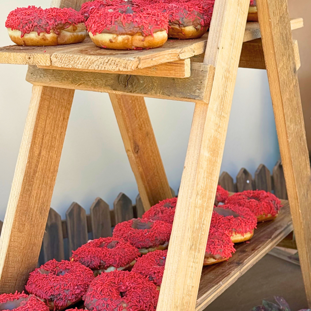 Δίπλα στο παραμυθένιο σκηνικό, ξεχώρισε η απόλυτη γλυκιά γωνιά της ημέρας: το candy bar βάπτισης, προσεγμένο ως την τελευταία του λεπτομέρεια! Ολόκληρες ξύλινες συνθέσεις σε φυσικούς τόνους στήθηκαν με μεράκι, και μετέτρεψαν τη γωνία σε σημείο χαράς και απόλαυσης για μικρούς και μεγάλους. Σε περίοπτη θέση, τα λαχταριστά ντόνατς, έκλεψαν την παράσταση, ενώ τα μπισκότα και τα cakepops, όλα σερβιρισμένα πάνω σε rustic ξύλινους δίσκους και σε φυσικούς κορμούς δέντρων, δημιούργησαν μια ατμόσφαιρα ζεστή, αυθεντική, γεμάτη ευχαρίστηση. Λουλούδια σε πορτοκαλί, κόκκινες και χρυσαφιές αποχρώσεις στόλιζαν το candy bar, δίνοντας ένταση και χρώμα ενώ γυάλες με δροσερή λεμονάδα και φυσικούς χυμούς ολοκλήρωναν το σκηνικό!