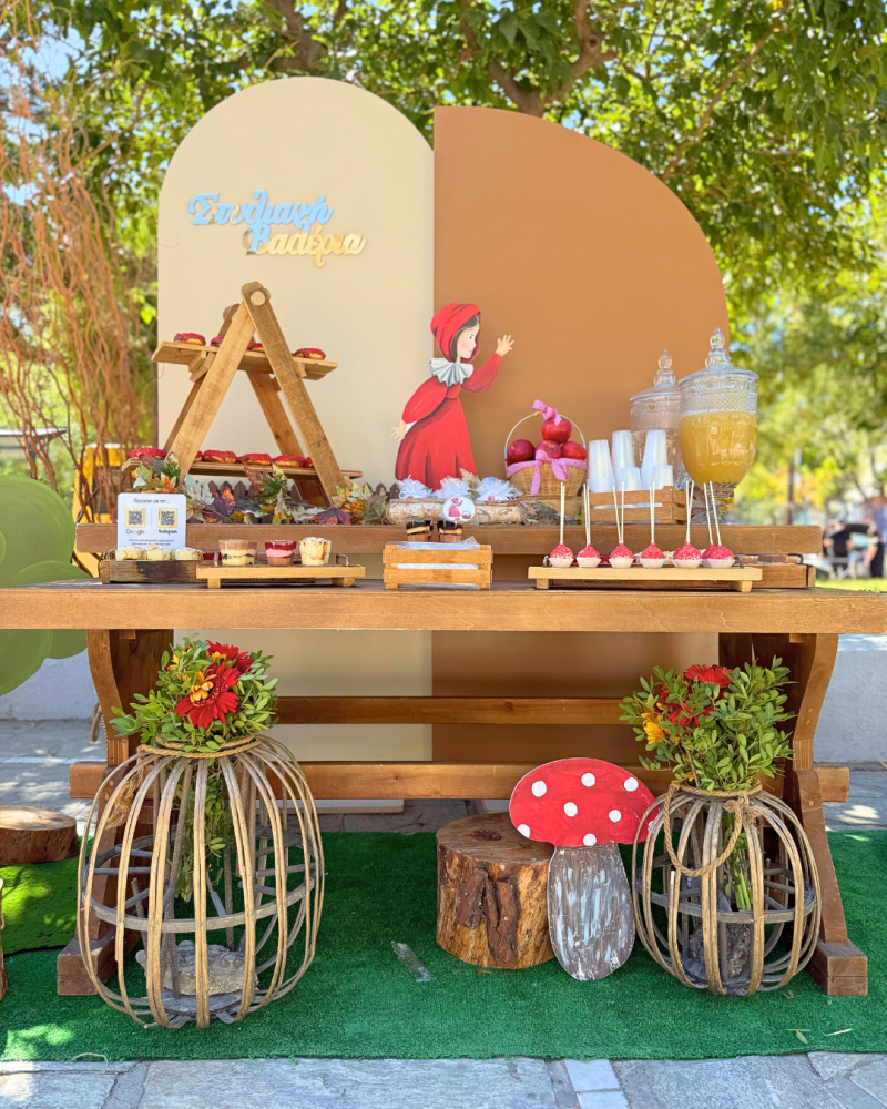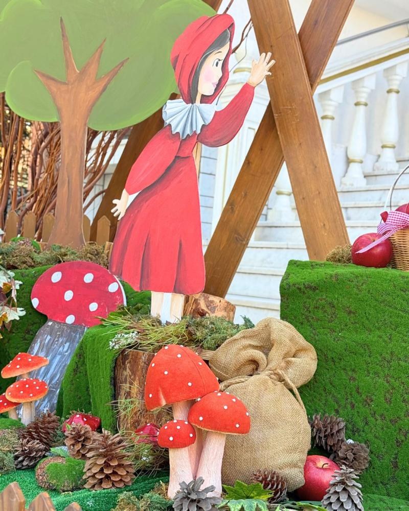 Χρωματιστά μανιτάρια σε κόκκινο και λευκό, απλωμένα πάνω σε βελούδινο, πράσινο γρασίδι, κουκουνάρια, κορμοί ξύλου και φυσικές πρασινάδες έδωσαν μοναδική νότα στη διακόσμηση, ενώ τα καλαθάκια με λαχταριστά κόκκινα μήλα, με ρομαντικούς φιόγκους, σαν αυτά που θα διάλεγε η ίδια η Κοκκινοσκουφίτσα για το ταξίδι της, δίνουν την αίσθηση παραμυθιού. Χειροποίητες φιγούρες και ξύλινα διακοσμητικά, σε ζεστές αποχρώσεις, δημιουργούν το απόλυτο σκηνικό εξερεύνησης και μαγείας!