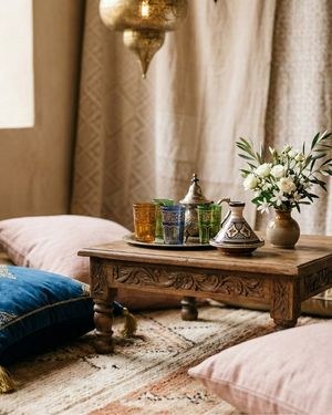 · Χαμηλή επίπλωση: poufs, μαξιλάρες δαπέδου και χαμηλά τραπεζάκια αποδίδουν τη χαμηλή, οικεία τυπολογία καθιστικού του Μαρόκου, η οποία συνδέεται με την ιδέα της συντροφικότητας και της ανεπίσημης συνεύρεσης.