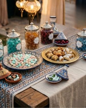 · Γυάλες με καπάκι γεμάτες πολύχρωμα ζαχαρωτά, των οποίων η χρωματική γκάμα ακολουθεί την επιλεγμένη παλέτα (π.χ. αποχρώσεις τιρκουάζ, κεχριμπαριού και κεραμιδί για πιο «oriental» ανάγνωση).