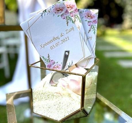 Μετά το μυστήριο η επόμενη μεγάλη στιγμή είναι η στιγμή της δεξίωσης. Κατά την είσοδο των καλεσμένων στον χώρο, μια θαυμάσια ιδέα, εκτός από τα γυάλινα κάδρα καλωσορίσματος, είναι το τραπέζι ευχών όπου οι καλεσμένοι θα μπορούν να γράψουν στο βιβλίο ευχών γάμου (ευχολόγιο) τις ευχές τους για τους νεόνυμφους.