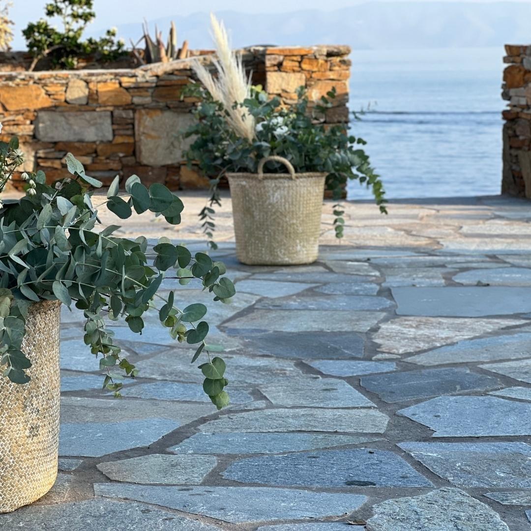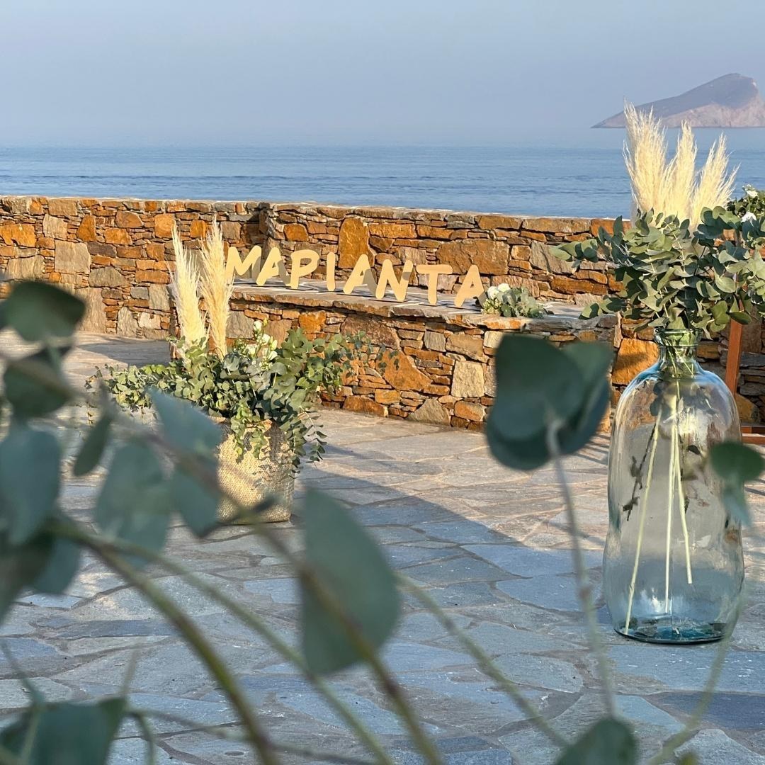 Ο γάμος και η βάπτιση τους στο νησί είχε και τον ανάλογο ανθοστολισμό. Επέλεξαν μοντέρνα βάζα και ψάθινα καλάθια τα οποία είχαν συνθέσεις απο ευκάλυπτο, pampas και λυσίανθο. Με αυτή τη λογική κινηθήκαμε και για τις λαμπάδες γάμου, για τη νυφική ανθοδέσμη της Αλεξάνδρας, για το στολισμό του αυτοκινήτου και του σκάφους που μετέφερε το ζευγάρι αλλά και τον υπέροχο στολισμό κολυμπήθρας της μικρής Μαριάντας!
