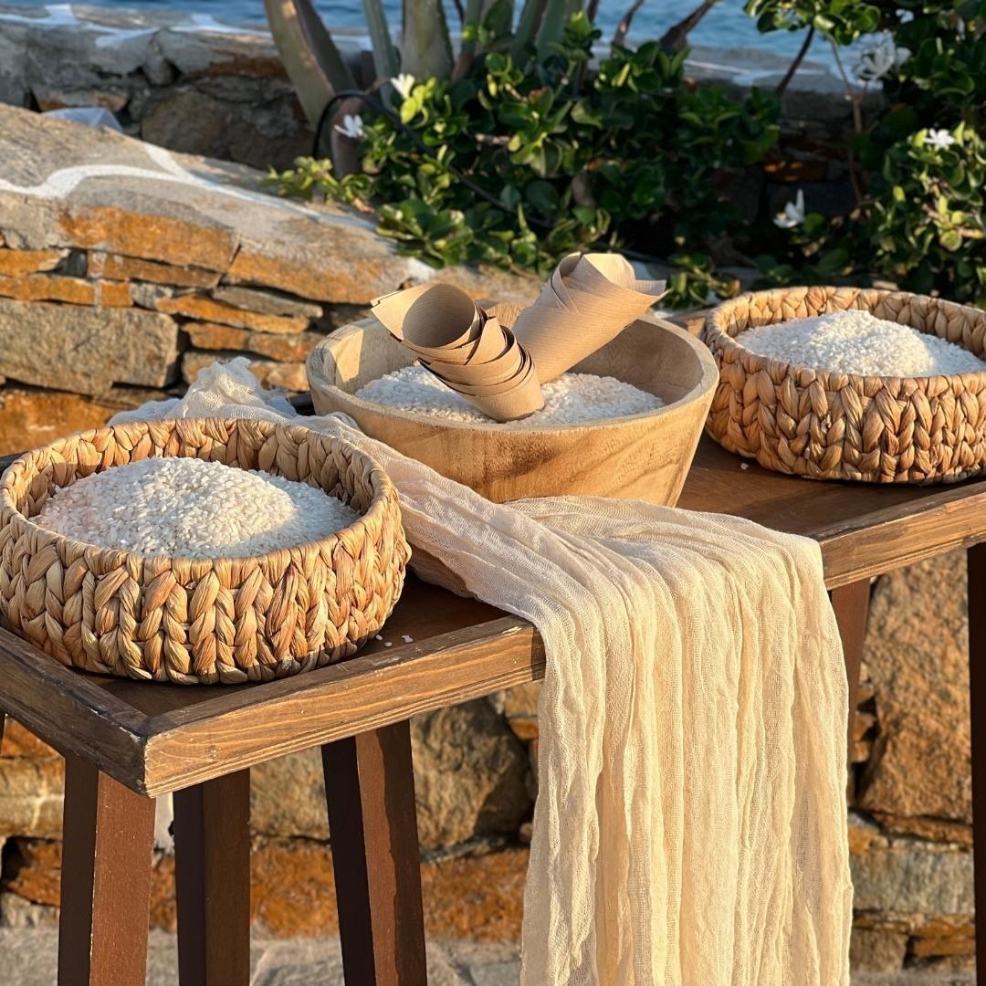 Ο γάμος σε νησί εξυμνεί τα φυσικά τοπία και τη θάλασσα που αγκαλιάζει από άκρη σε άκρη την Ελλάδα. Δεδομένου αυτού, θα επιλέξεις και την ανάλογη χρωματική παλέτα για το στολισμό γάμου αλλά και το στολισμό βάπτισης. Όσον αφορά τις αποχρώσεις κινήθηκαν σε γήινα χρώματα με κυρίαρχο το ιβουάρ. Προσθέτοντας διάφορες γυάλες στο στολισμό τους, βοηθήσαμε στο να διαπερνά το άπλετο φυσικό φως.