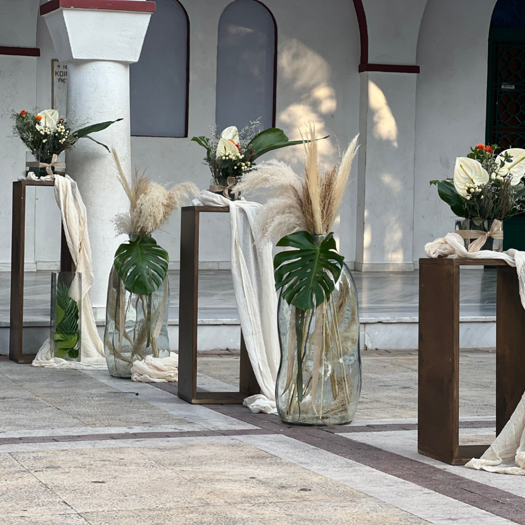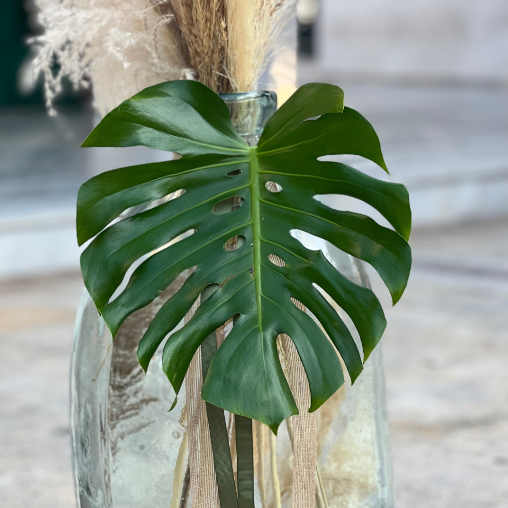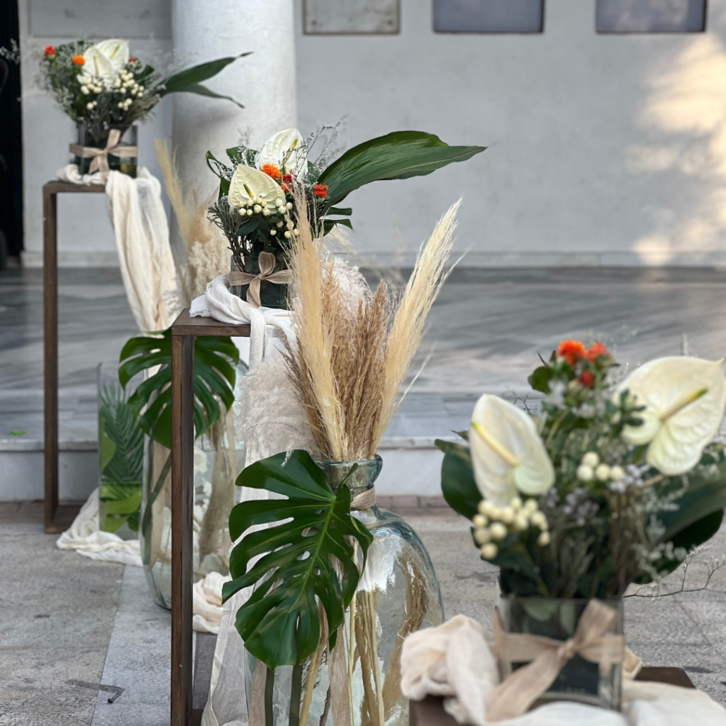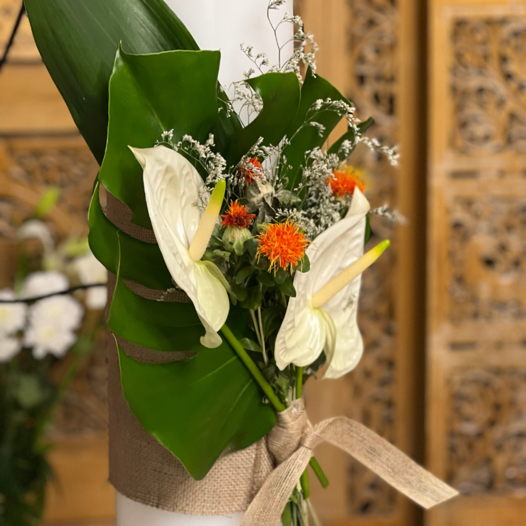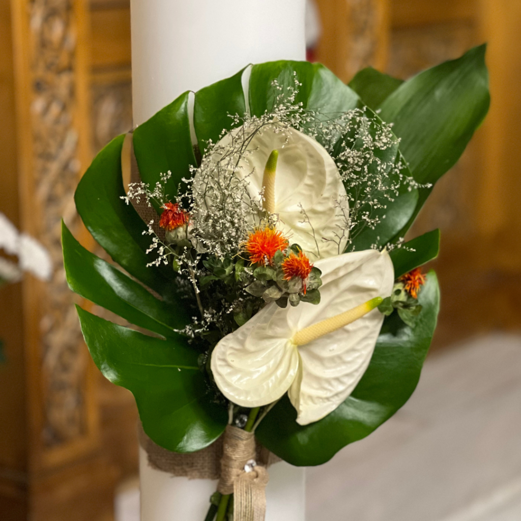 Στο γάμο που σας παρουσιάζουμε, δημιουργήσαμε μία tropical νυφική ανθοδέσμη με εξωτικά φύλλα και ανθούρια ενώ σε tropicalstyle κινήθηκαν και οι λαμπάδες του γάμου, προσδίδοντας αρμονία στη διακόσμηση!
