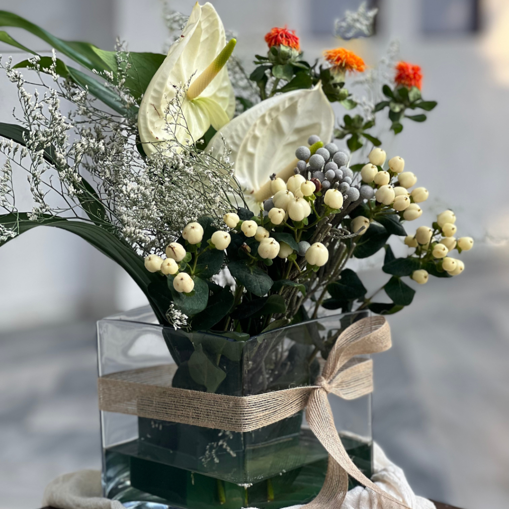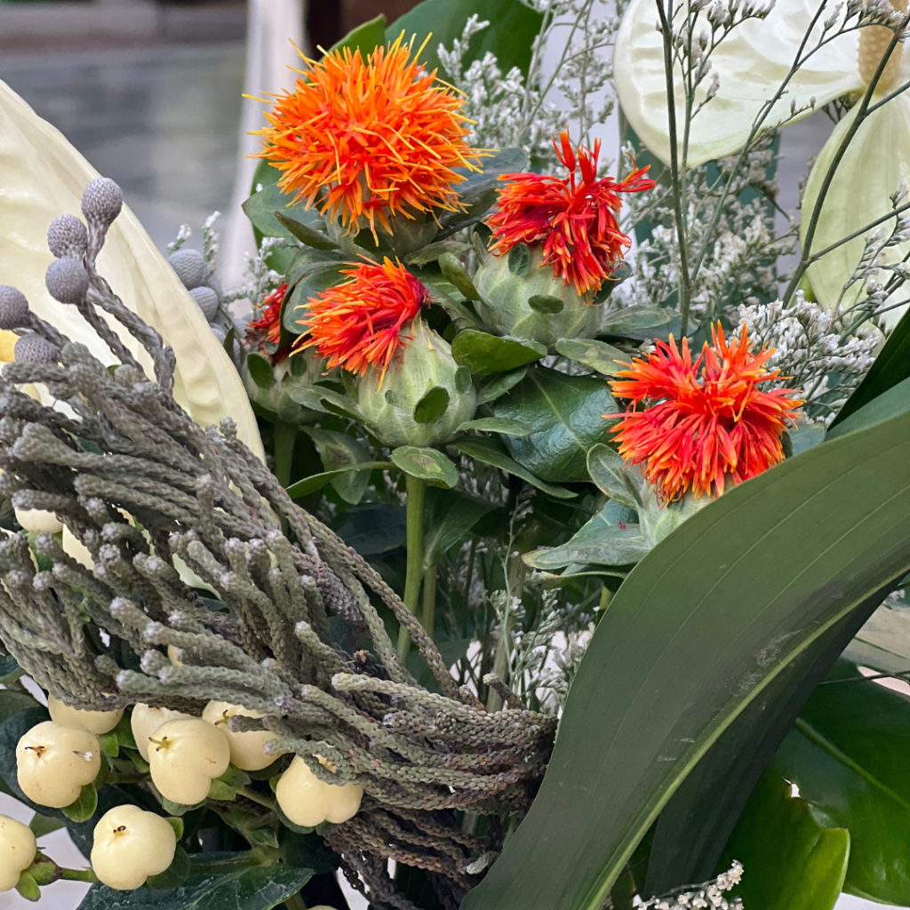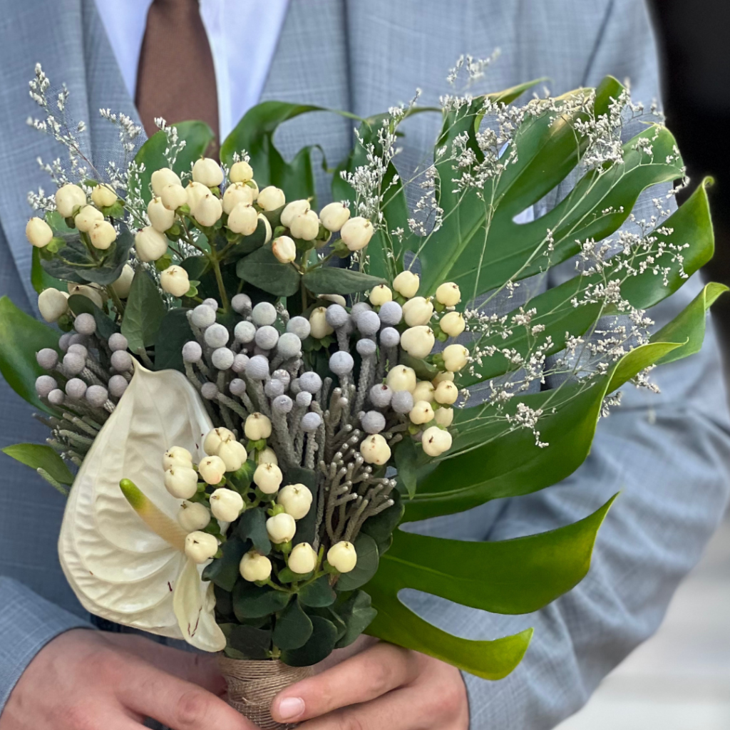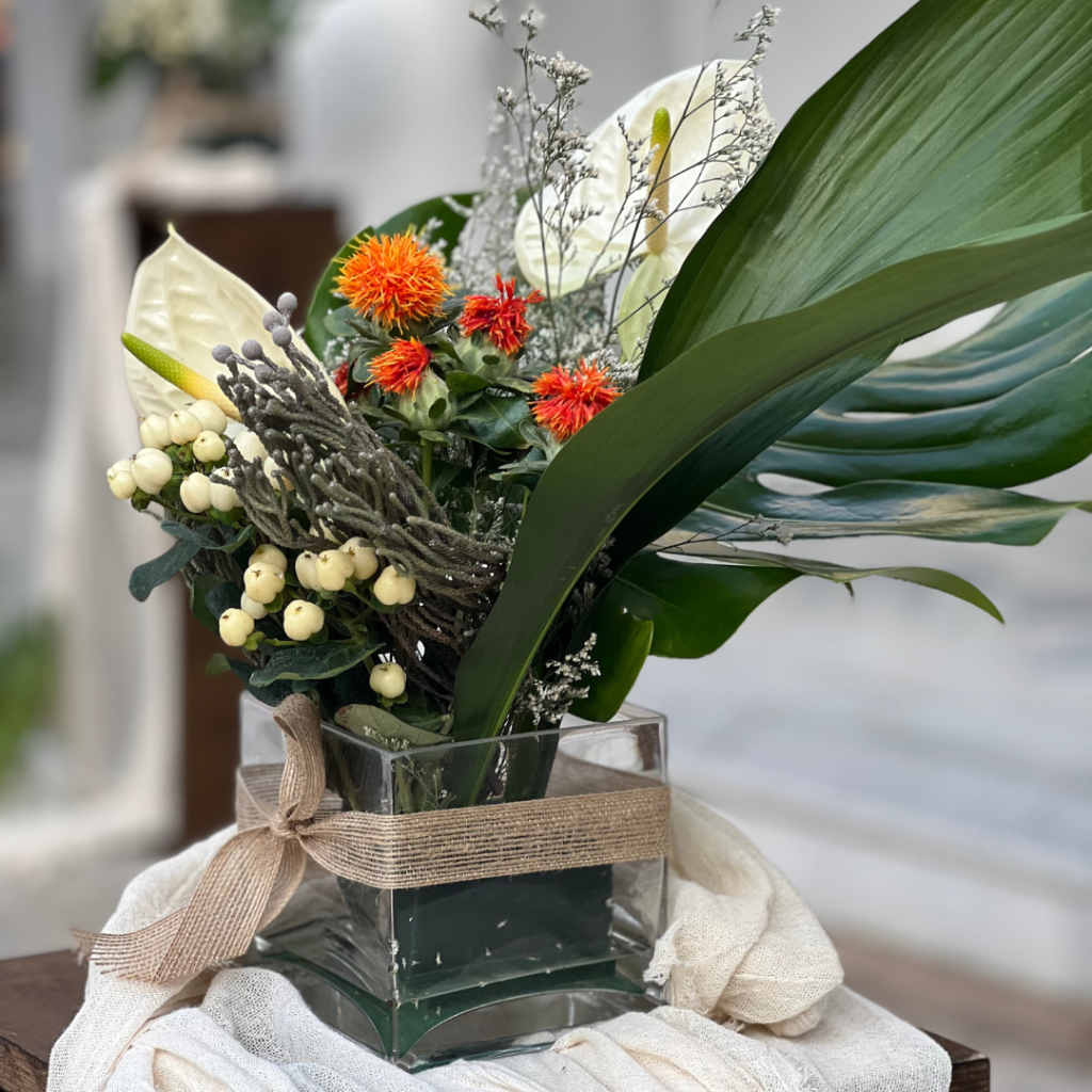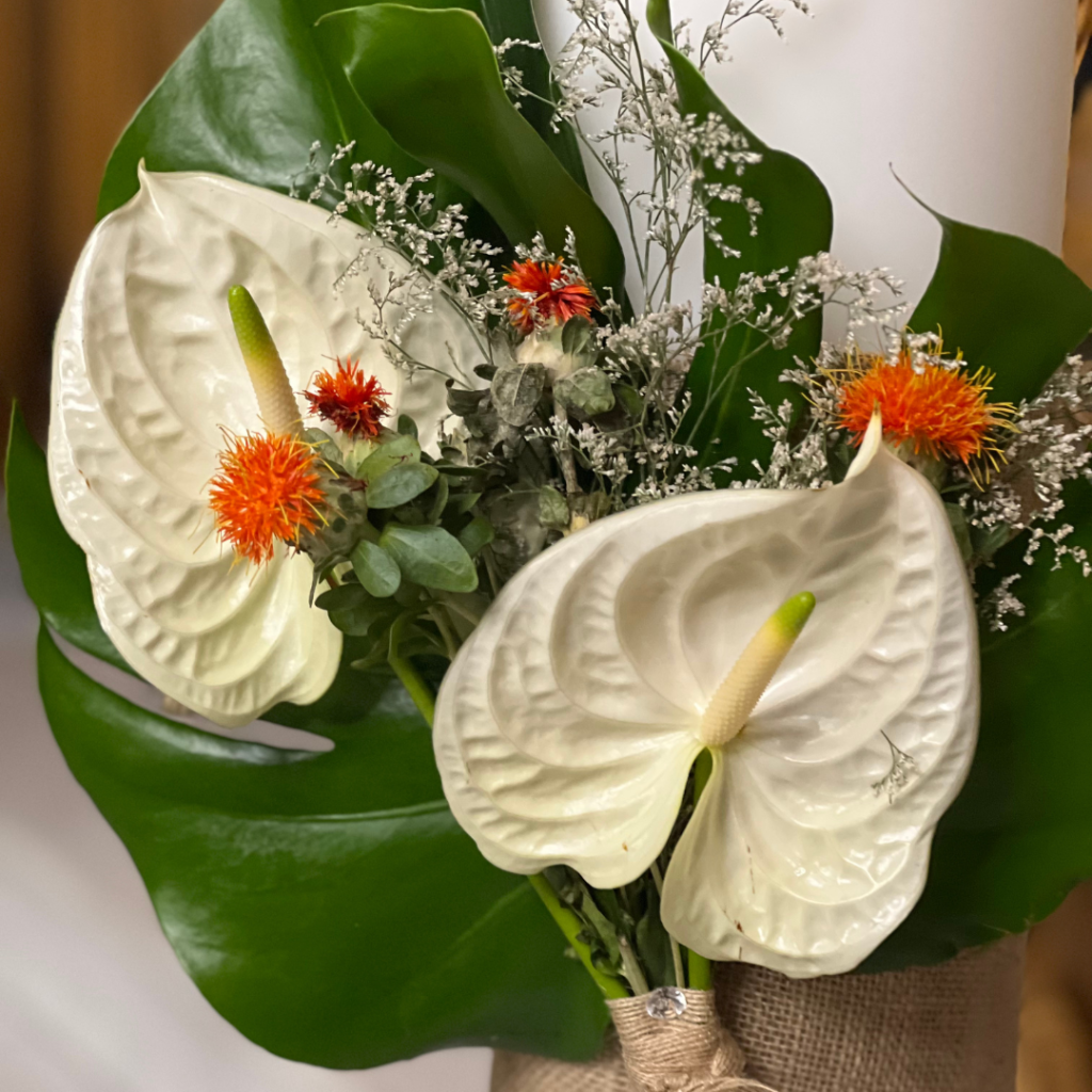 Στο γάμο που σας παρουσιάζουμε, δημιουργήσαμε μία tropical νυφική ανθοδέσμη με εξωτικά φύλλα και ανθούρια ενώ σε tropicalstyle κινήθηκαν και οι λαμπάδες του γάμου, προσδίδοντας αρμονία στη διακόσμηση!