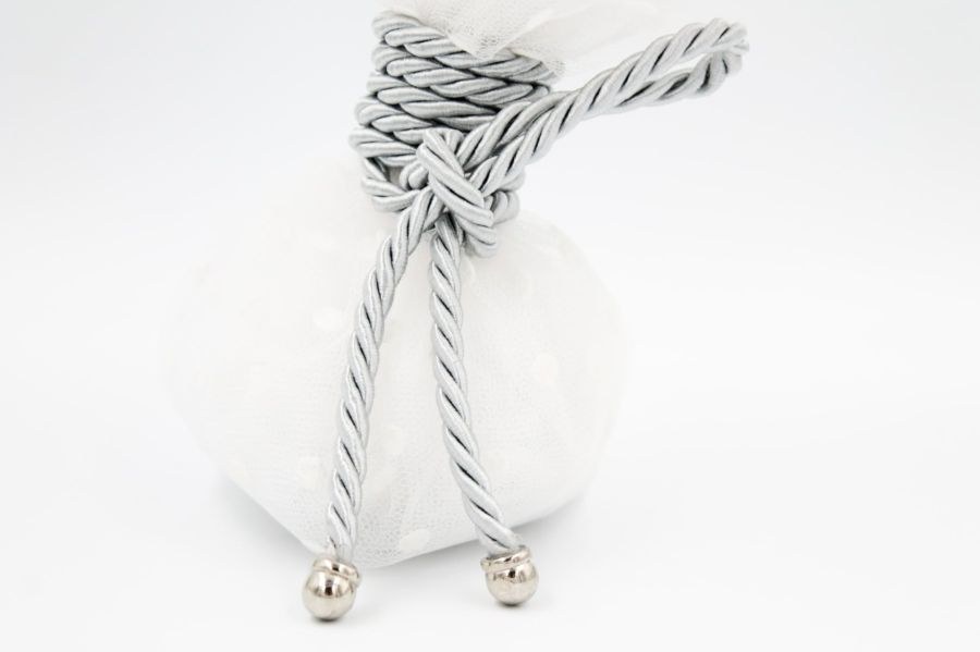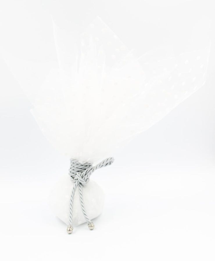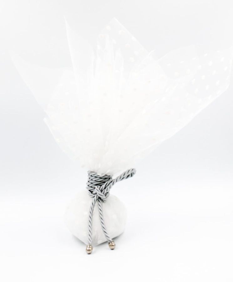 Μπομπονιέρα γάμου με 3 τούλια λευκά και δέσιμο λαιμός με τρίκλωνο γκρι κορδόνι με χρυσά μεταλλικά τελειώματα.