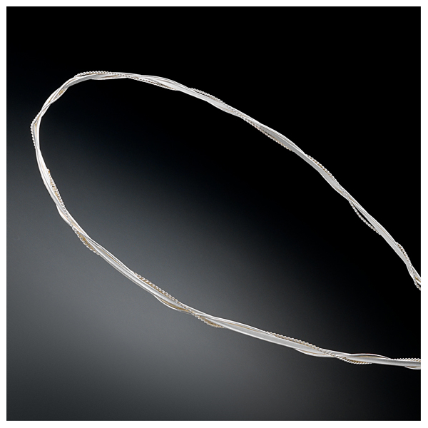 β) Στριφτό και λευκό ασημένιο κορδόνι πλεγμένα μεταξύ τους.