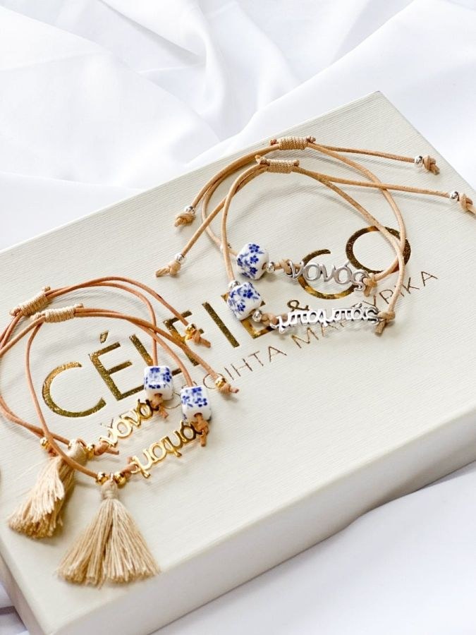 Βραχιόλι με δέρμα, μοτιφ κύβου με μπλε λουλούδια και μπεζ φούντα (μαμά, νονά, μπαμπάς, νονός).