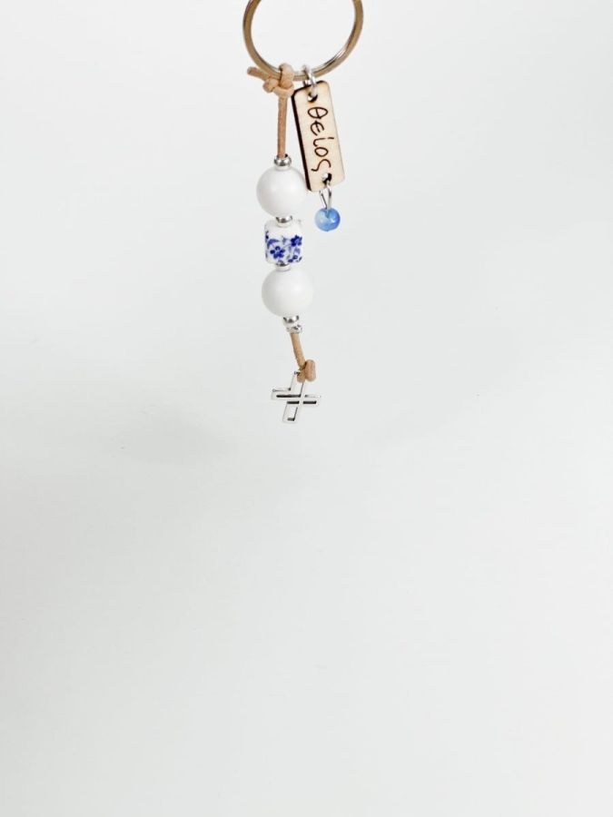 Μπρελοκ με άσπρες χάντρες,πορσελάνινη,ξύλινη επιγραφή,σταυρό και γαλάζια χάντρα.