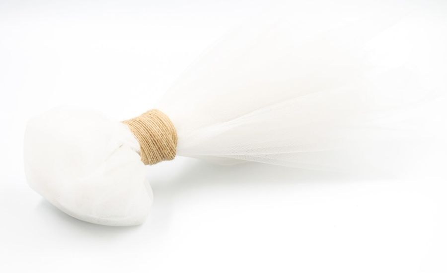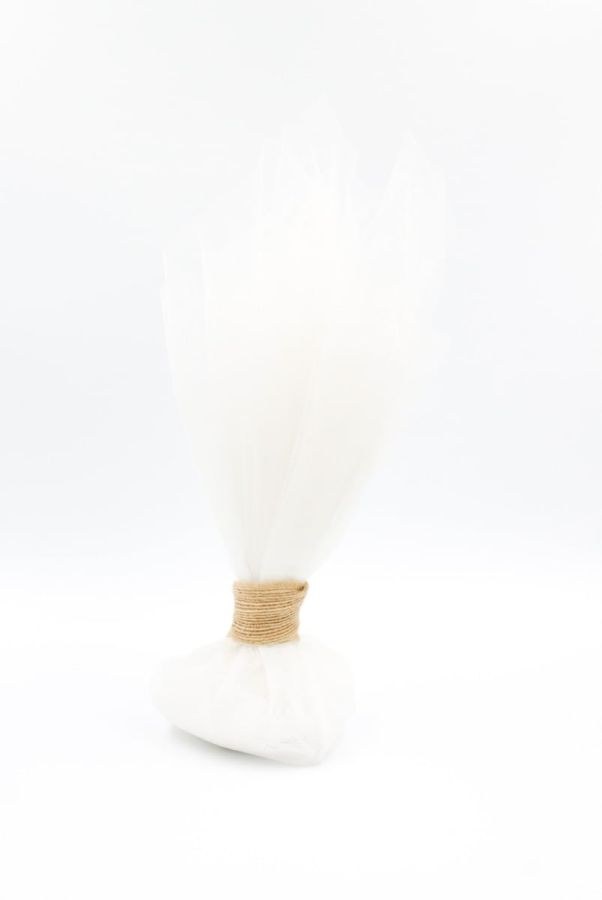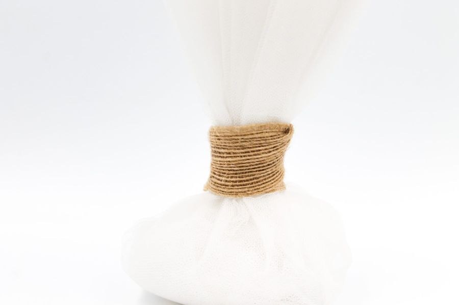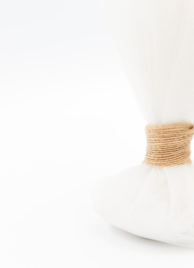Μπομπονιέρα με 3 τούλια λευκά και δέσιμο λαιμός με κορδέλα λινάτσας.