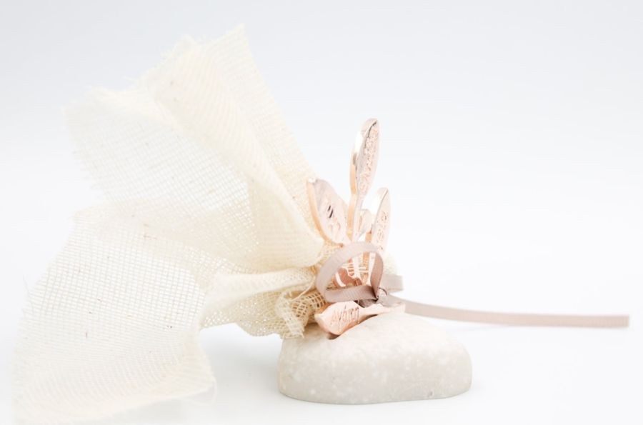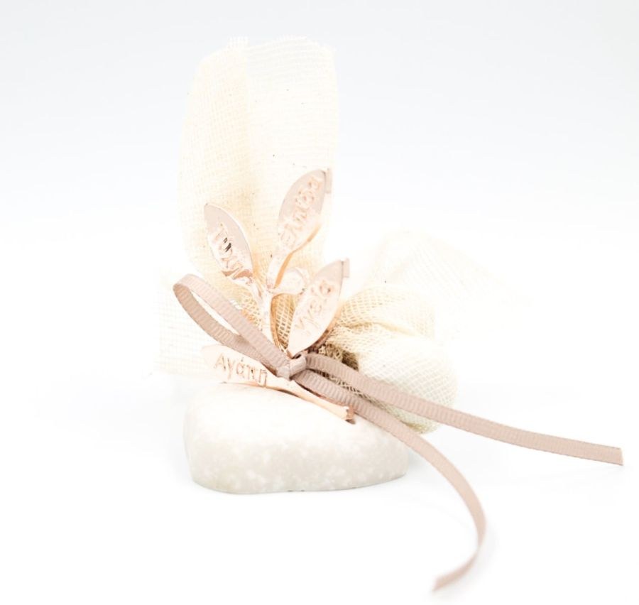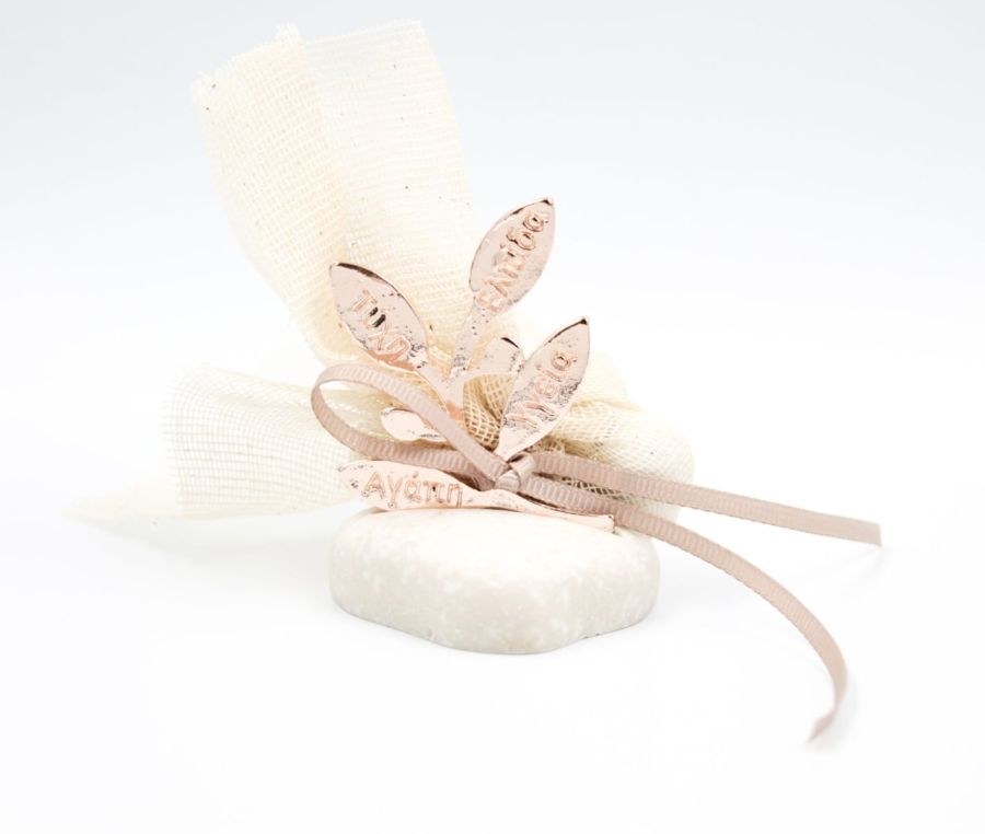 Μπομπονιέρα γάμου διακοσμητική πέτρα με μεταλλικό κλαδί ελιάς με ευχές σε ροζ χρυσό.