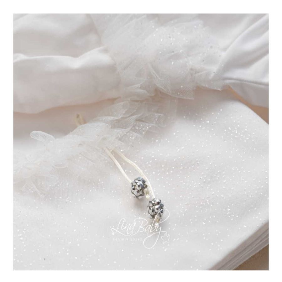 Βαμβακερό σετ λαδόπανου σε εκρού χρώμα με βαμβακερή φάσα και τούλι γκλίτερ ασημί , βολάν φρου-φρου, τρέσα γκρο και ασημί χάντρες. Πετσέτα 90*140*360g.