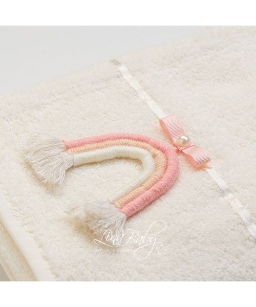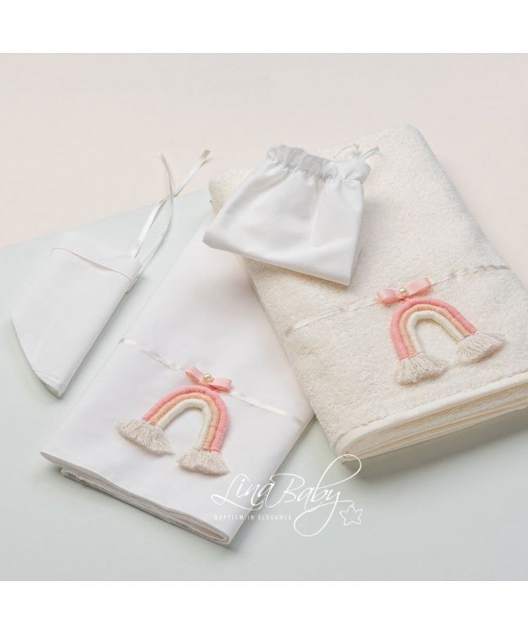 Βαμβακερό σετ λαδόπανου σε εκρού χρώμα με σατέν τρέσα, ροζ φιογκάκι και μακραμέ χειροποίητο διακοσμητικό ουράνιο τόξο.