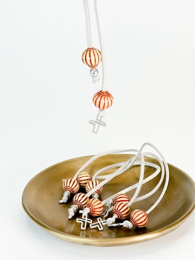 Μαρτυρικό κομπολόι με γκρί σουέτ κορδόνι,δίχρωμες χάντρες και σταυρό. Οι φωτογραφίες έχουν υποστεί επεξεργασία, ίσως να διαφέρουν λίγο τα χρώματα στην πραγματικότητα.