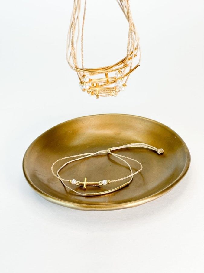 Μαρτυρικό βραχιολάκι διπλό με χρυσές αποχρώσεις με σταυρό και περλίτσες.