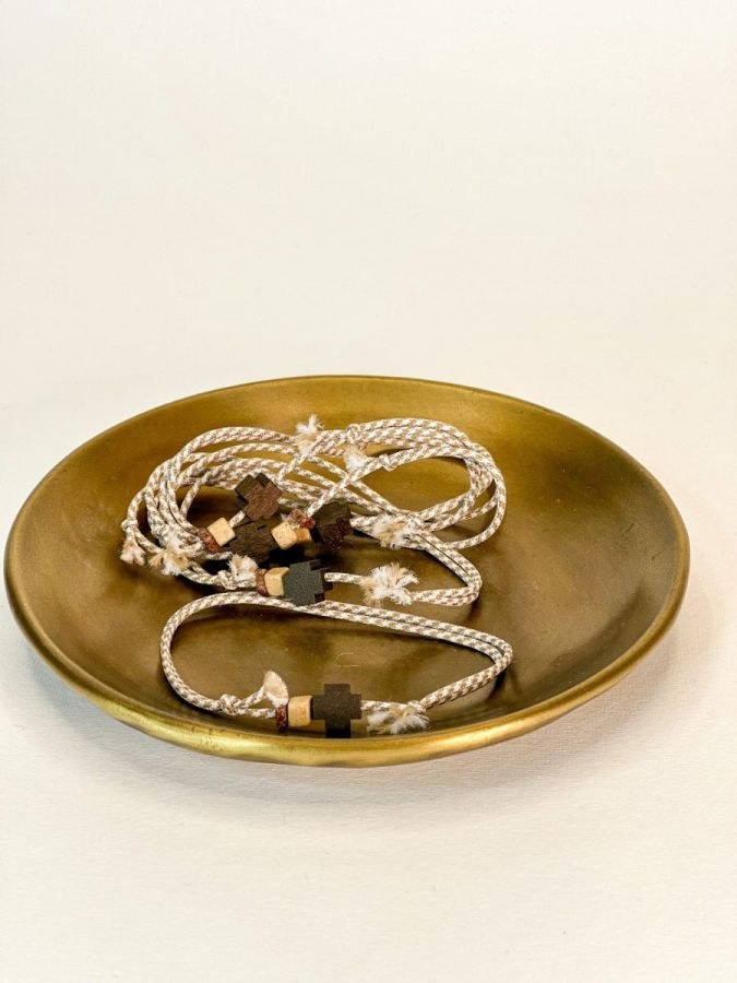 Μαρτυρικό βραχιόλι με καφέ σταυρό,μπεζ χάντρα,καφε ροδέλα και δίχρωμο κορδόνι σε απόχρωση μπεζ και λευκή. Οι φωτογραφίες έχουν υποστεί επεξεργασία, ίσως να διαφέρουν λίγο τα χρώματα στην πραγματικότητα.