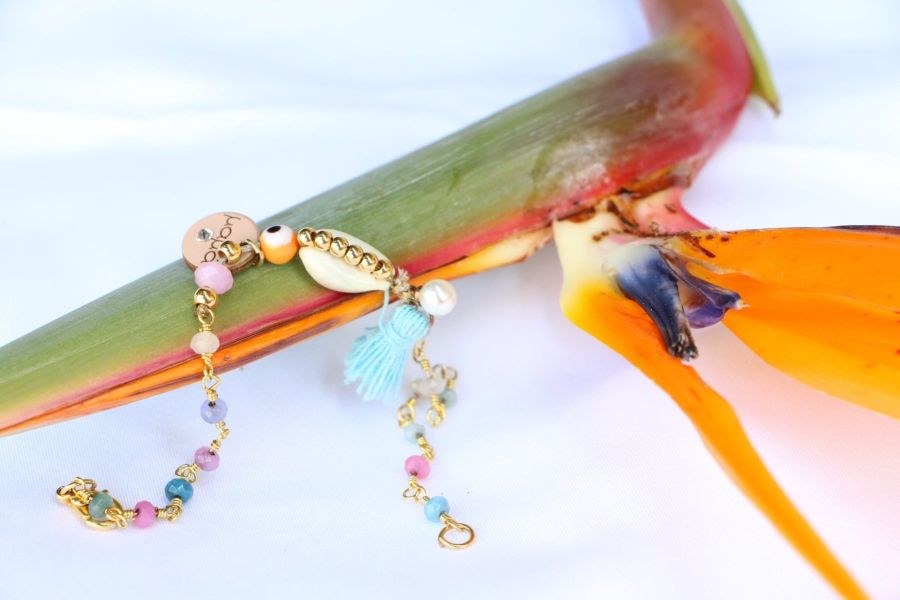Επιχρυσωμένο βραχιόλι με πορτοκαλί μάτι,χρωματιστές χάντρες,μπλέ φούντα,άσπρη πέτρα.