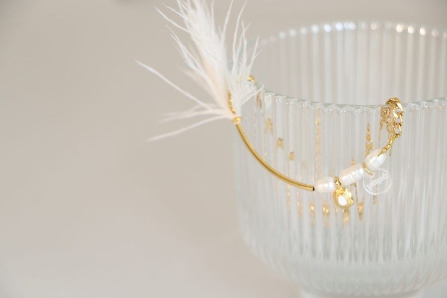 Βραχιολάκι μαμά νονά με λευκό φτερό και με πέρλες.