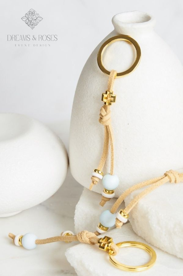 Αν προτιμάτε κάτι διαφορετικό από το κλασικό βραχιόλι, αυτά τα μαρτυρικά βάπτισης σε μορφή μπρελόκ είναι η τέλεια λύση. Με μπεζ suede κορδόνι, χρυσό μεταλλικό σταυρό και κεραμικές χάντρες σε απαλό γαλάζιο και λευκό, αποτελούν ένα χρηστικό και καλαίσθητο αναμνηστικό για τους καλεσμένους σας.