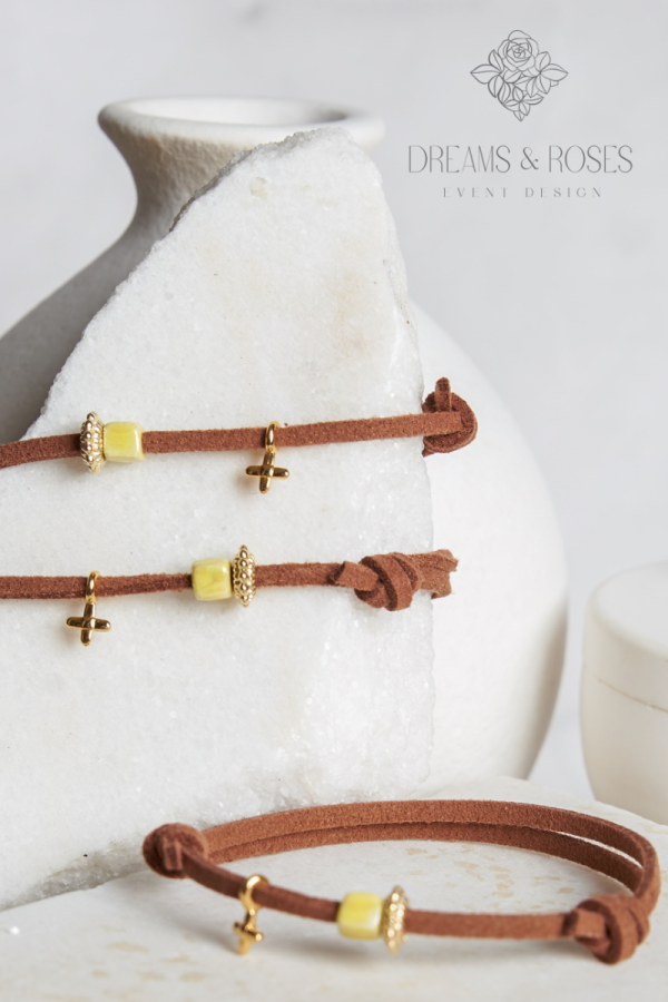Για μια βάπτιση με γήινα χρώματα και φυσικά υλικά, επιλέξτε μαρτυρικά βάπτισης σε ταμπά αποχρώσεις. Το suede κορδόνι αναδεικνύει τον επίχρυσο σταυρό 24Κ, ενώ η κεραμική κυβική χάντρα προσθέτει μια artistic πινελιά. Ένα διακριτικό και "ζεστό" βραχιόλι που φοριέται εύκολα από κάθε καλεσμένο.
