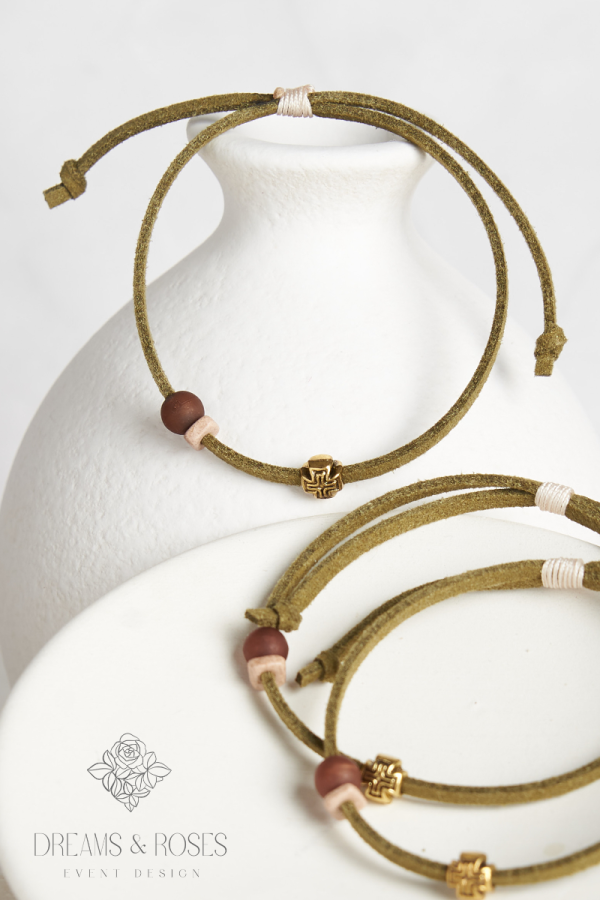 Αναζητάτε μαρτυρικά βάπτισης σε γήινους τόνους; Η σειρά αυτή από suede κορδόνι σε λαδί προσφέρει ένα rustic αποτέλεσμα. Με κεντρικό στοιχείο έναν ανάγλυφο χρυσό σταυρό και χειροποίητες κεραμικές χάντρες, αυτά τα βραχιόλια είναι ταυτόχρονα διακριτικά και ποιοτικά, κατάλληλα για άνδρες και γυναίκες.
