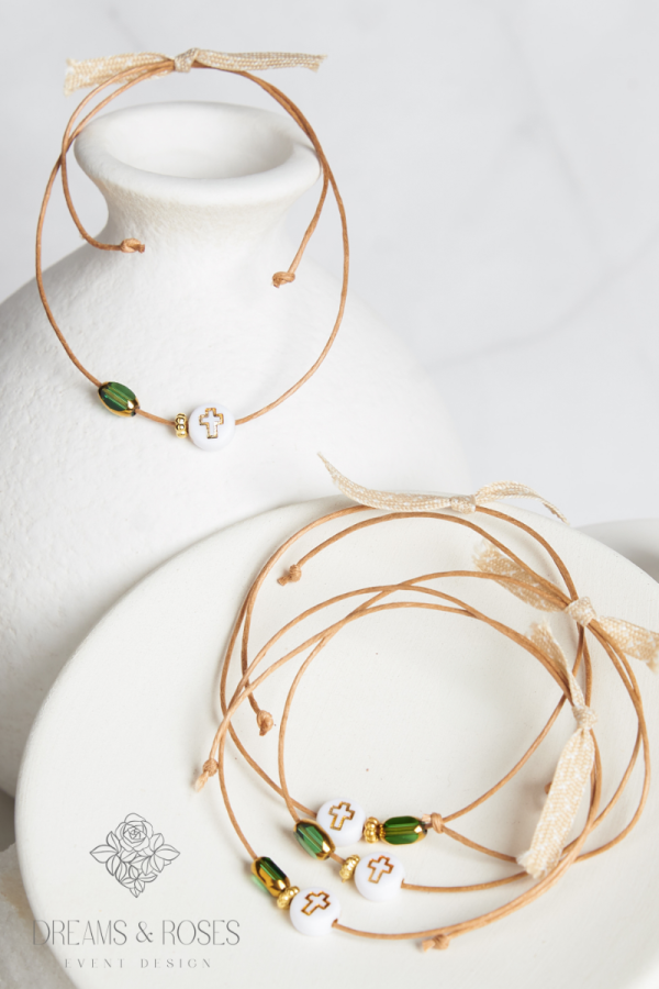 Η δύναμη της απλότητας στα μαρτυρικά βάπτισης. Διαθέσιμα σε καφέ κερωμένο κορδόνι, αυτά τα βραχιόλια κοσμούνται από έναν minimal λευκό ακρυλικό σταυρό με χρυσές λεπτομέρειες και μια κομψή πράσινη ή χρυσή χάντρα. Η ιδανική επιλογή για όσους αναζητούν κάτι διακριτικό και οικονομικό χωρίς συμβιβασμούς στην ποιότητα.