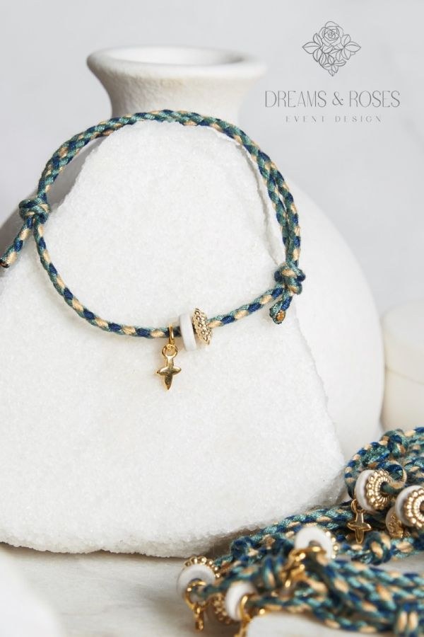Η πολυτέλεια κρύβεται στη λεπτομέρεια αυτών των χειροποίητων μαρτυρικών βάπτισης. Το ιδιαίτερο τρίχρωμο κορδόνι σε αποχρώσεις του πράσινου και του χρυσού συνδυάζεται με έναν ντελικάτο επίχρυσο σταυρό 24Κ και λευκά κεραμικά στοιχεία. Μια αριστοκρατική επιλογή που θα κλέψει τις εντυπώσεις.