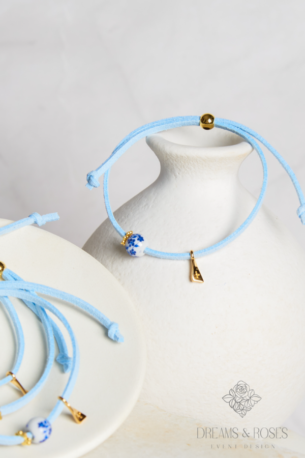 Η κομψότητα της πορσελάνης συναντά τα μαρτυρικά βάπτισης. Το γαλάζιο suede κορδόνι συνδυάζεται με μια ιδιαίτερη κεραμική χάντρα με μπλε λουλουδάτο μοτίβο και έναν μινιμαλιστικό επίχρυσο σταυρό 24Κ. Ένα διαχρονικό κόσμημα-ενθύμιο που αποπνέει αριστοκρατικό αέρα και φινέτσα.