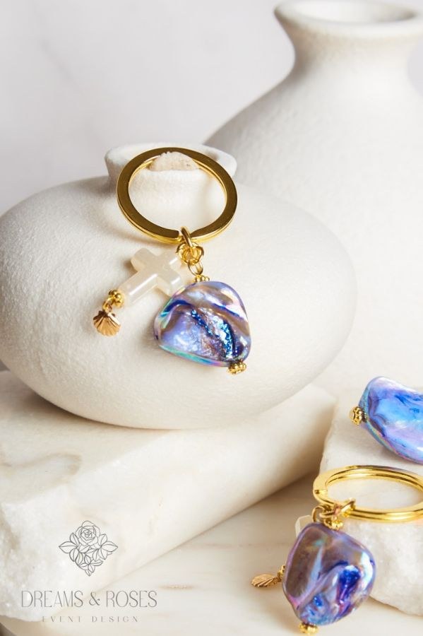 Για μια βάπτιση που θυμίζει καλοκαιρινό όνειρο, επιλέξτε μαρτυρικά βάπτισης που κλέβουν την παράσταση. Το μπρελόκ αυτό διαθέτει μια εντυπωσιακή πολύμορφη πέτρα με ιριδίζουσες μπλε ανταύγειες, έναν λευκό ακρυλικό σταυρό και ένα ντελικάτο επίχρυσο κοράλλι 24Κ. Ένα μικρό έργο τέχνης που οι καλεσμένοι σας θα κρατήσουν για πάντα.