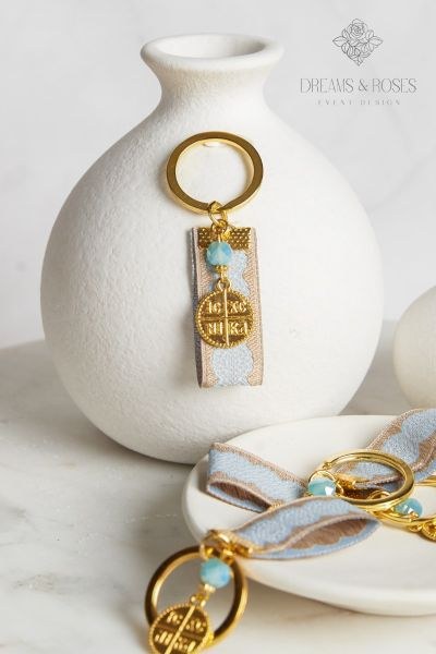 Για μια βάπτιση που αποπνέει αρχοντιά, επιλέξτε μαρτυρικά βάπτισης με παραδοσιακά σύμβολα σε σύγχρονη εκτέλεση. Αυτό το μπρελόκ διαθέτει ένα εντυπωσιακό επίχρυσο Κωνσταντινάτο φλουρί και μια πολύμορφη γαλάζια χάντρα, δεμένα πάνω σε μια εξαιρετικής ποιότητας υφαντή κορδέλα σε μπεζ-γαλάζιο χρώμα. Ένα πολύτιμο ενθύμιο που θα εκτιμηθεί για την αισθητική και τον συμβολισμό του.