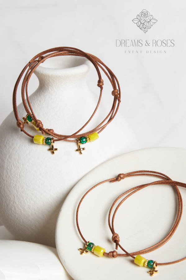 Για μια βάπτιση με έντονο χαρακτήρα και γήινα χρώματα, αυτά τα μαρτυρικά βάπτισης είναι η τέλεια επιλογή. Το καφέ κερωμένο κορδόνι φιλοξενεί έναν επίχρυσο σταυρό 24Κ, μια ζωηρή κίτρινη πολύμορφη χάντρα και μια πράσινη λεπτομέρεια. Ένας ιδιαίτερος χρωματικός συνδυασμός που αποπνέει αισιοδοξία και πρωτοτυπία.