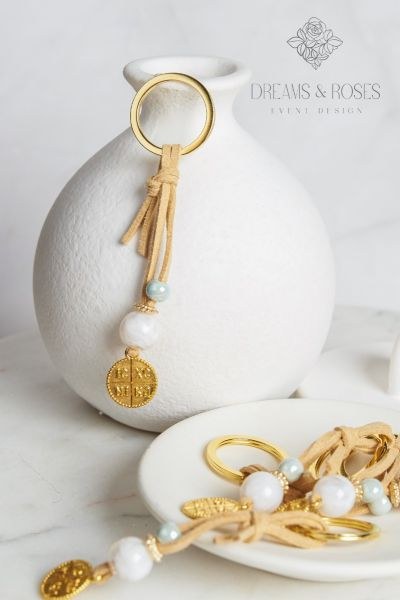 Για μια βάπτιση που τιμά την παράδοση με μια σύγχρονη ματιά, τα μαρτυρικά βάπτισης με Κωνσταντινάτο είναι η ιδανική επιλογή. Αυτά τα χειροποίητα μπρελόκ διαθέτουν ένα εντυπωσιακό επίχρυσο Κωνσταντινάτο φλουρί και συνδυάζουν κομψές κεραμικές λεπτομέρειες σε μπεζ τόνους.