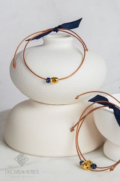 Η επιτομή του minimal design στα μαρτυρικά βάπτισης. Το λεπτό ταμπά κερωμένο κορδόνι φιλοξενεί έναν χρυσό μεταλλικό σταυρό και μια μπλε χάντρα Miyuki, ενώ το κλείσιμο ολοκληρώνεται με έναν κομψό φιόγκο από navy blue υφασμάτινη κορδέλα. Μια πρόταση που συνδυάζει διαφορετικές υφές με απόλυτη επιτυχία.