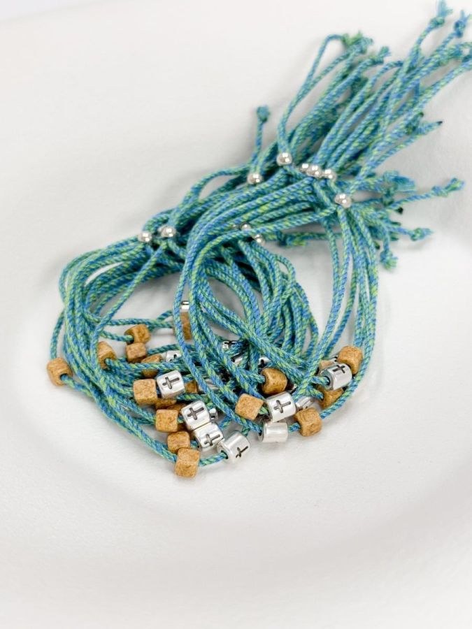 Μαρτυρικό βάπτισης με σιέλ-βεραμάν κορδόνι, λευκές πέρλες και ασημί σταυρό.