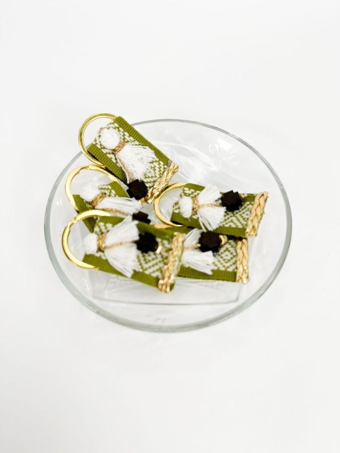 Μαρτυρικό μπρελοκ με δίχρωμη πράσινη|άσπρη τρέσα,φούντα εκρού και ξύλινο σταυρό.
