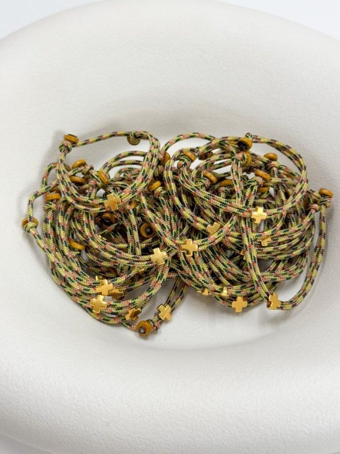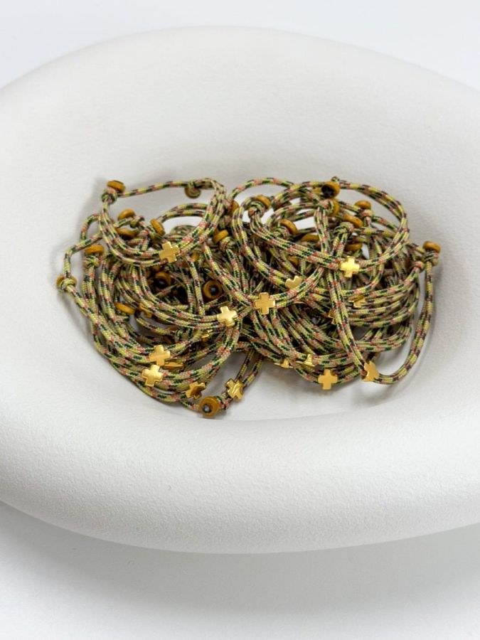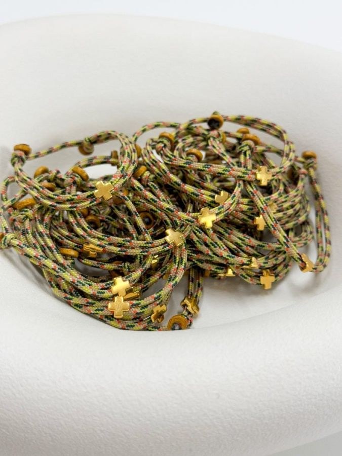 Μαρτυρικό βραχιόλι με επιχρυσωμένο σταυρό, ροδέλες και τρίχρωμο κορδόνι.