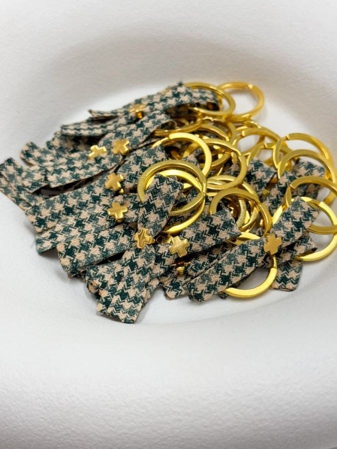 Μαρτυρικό βάπτισης με χρυσό μπρελόκ και σταυρό και πράσινες λεπτομέρειες στο μαρτυρικό.