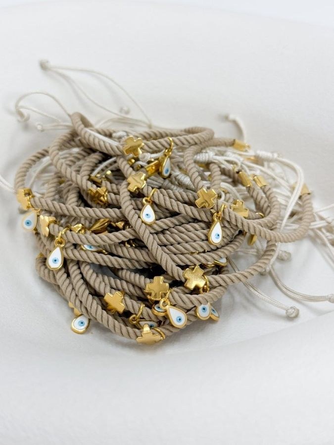 Μαρτυρικό βραχιόλι με επιχρυσωμένο σταυρό, μοτίφ μάτι, κλείσιμο μακραμέ και στριφτό κορδόνι.