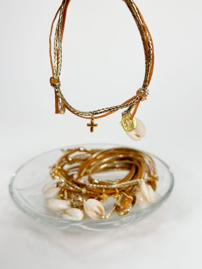 Μαρτυρικό βραχιόλι με διπλο ταμπά - χρυσό κορδόνι,κοχύλι,φλουρί και επιχρυσωμένο σταυρό.
