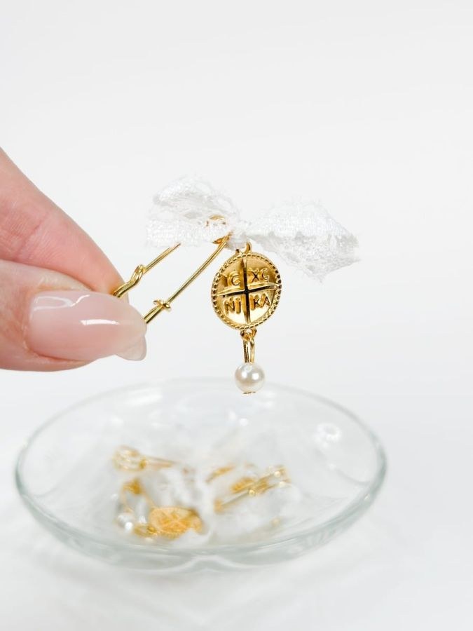 Μαρτυρικό πέτο με φιογκάκι απο δαντέλα,κωνσταντινάτο σταυρό και πέρλα.