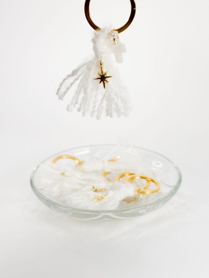 Μαρτυρικό μπρελοκ με λευκή χειροποίητη φούντα, μοτιφ αστέρι, φίλντισι σταυρό και πέρλες.