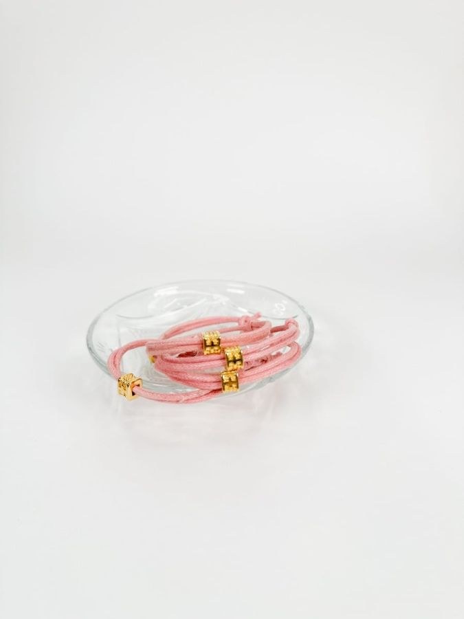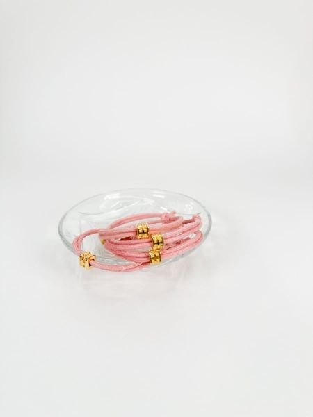 Μαρτυρικό βραχιόλι με ροζ κορδόνι και επιχρυσωμένο σταυρό.