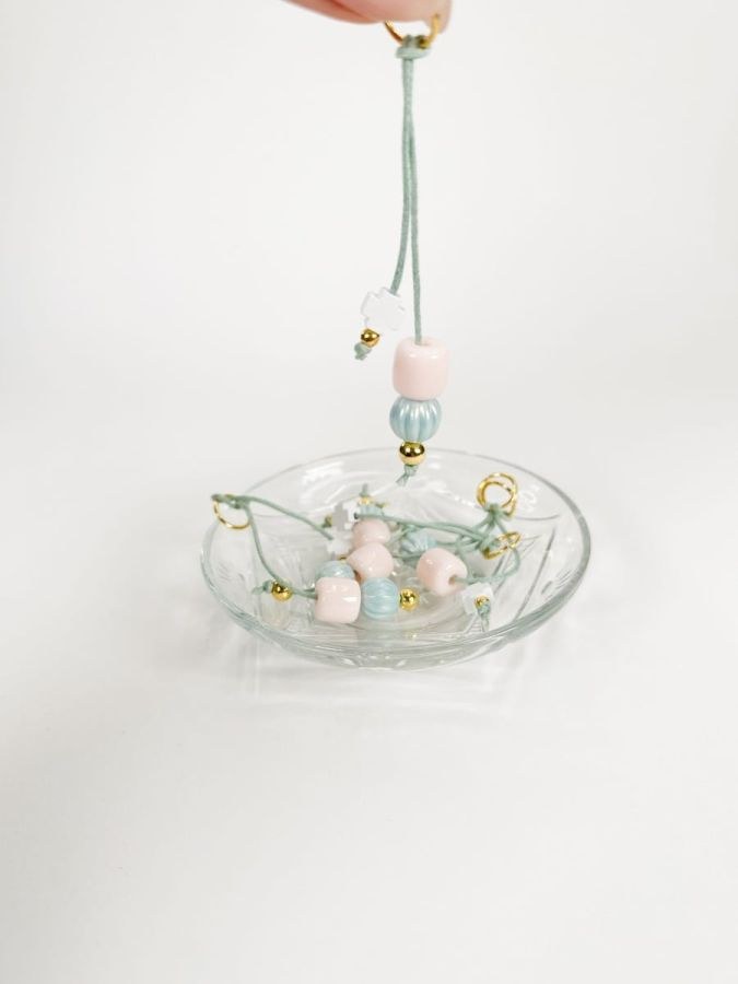 Μαρτυρικό μπρελοκ με ροζ χάντρα,περλε σιελ χάντρα και άσπρο ξύλινο σταυρό.
