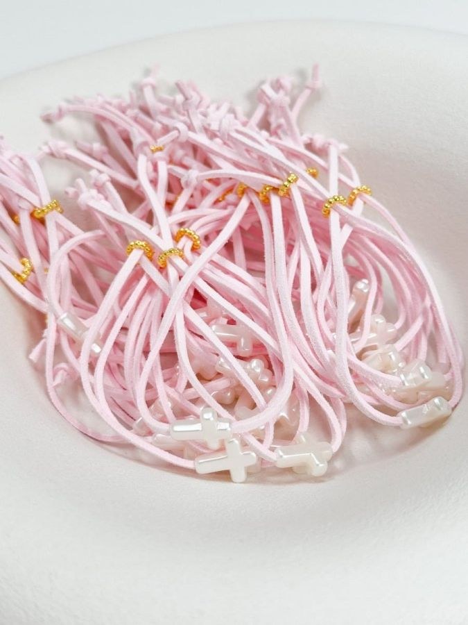 Μαρτυρικό βραχιόλι με περλε σταυρό , χρυσό δέσιμο και suede κορδόνι.