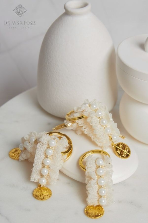Αν θέλετε να εντυπωσιάσετε με ένα αριστοκρατικό αναμνηστικό, αυτό το μπρελόκ είναι η ιδανική επιλογή για μαρτυρικά βάπτισης. Συνδυάζει μια ντελικάτη τρέσα από δαντέλα στην οποία είναι ραμμένες πέρλες, με ένα εντυπωσιακό επίχρυσο Κωνσταντινάτο φλουρί. Ένα premium αξεσουάρ που αποπνέει υψηλή αισθητική και ρομαντισμό.