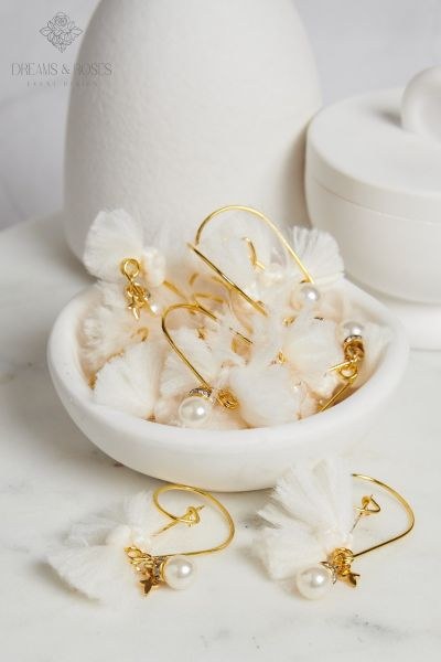 Πολυτελή μαρτυρικά βάπτισης πέτου που συνδυάζουν την κλασική πέρλα με το μοντέρνο στυλ. Η χρυσή παραμάνα στολίζεται με μια πλούσια λευκή φούντα (tassel), μια λαμπερή πέρλα και έναν ντελικάτο επίχρυσο σταυρό 24Κ. Ιδανικό για μια βάπτιση με θέμα την πέρλα ή για όσους αναζητούν ένα αριστοκρατικό αναμνηστικό.