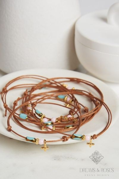 Ένας ιδιαίτερος χρωματικός συνδυασμός για μαρτυρικά βάπτισης με boho-chic αισθητική. Το λεπτό καφέ κερωμένο κορδόνι αναδεικνύει τον επίχρυσο σταυρό 24Κ, ο οποίος πλαισιώνεται από μια απαλή ροζ πέρλα και ένα εντυπωσιακό πολύμορφο στοιχείο σε τιρκουάζ απόχρωση. Μια artistic επιλογή που ξεφεύγει από τα κλασικά ροζ σχέδια.