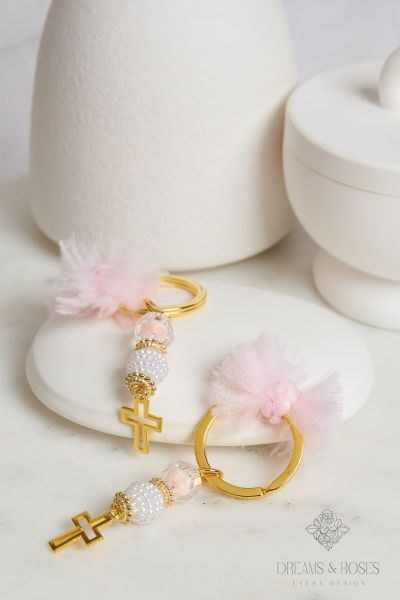 Μια πρακτική και καλαίσθητη εναλλακτική: τα μαρτυρικά βάπτισης G-33 σε μορφή μπρελόκ. Διαθέτουν χρυσό μεταλλικό σταυρό, ανάγλυφες πέρλες και πλούσιο ροζ τούλινο φιόγκο. Ένα ιδιαίτερο ενθύμιο που οι καλεσμένοι σας θα κρατήσουν για πάντα μαζί τους.