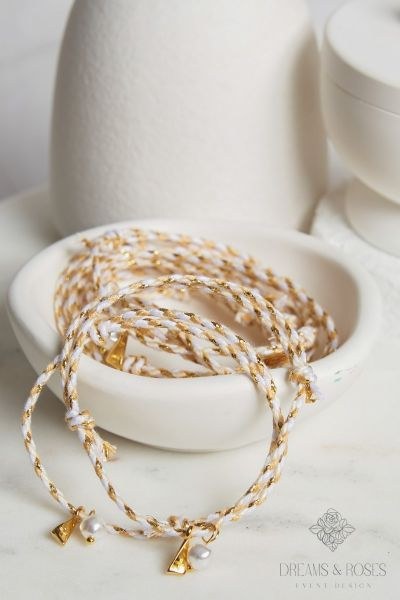 Αναζητάτε μαρτυρικά βάπτισης που να αποπνέουν λάμψη και κοριτσίστικη γοητεία; Το χειροποίητο βραχιόλι G-4 συνδυάζει ένα ιδιαίτερο πλεκτό κορδόνι με χρυσοκλωστή, έναν ντελικάτο επίχρυσο σταυρό 24Κ και μια διακριτική πέρλα. Μια φωτεινή και κομψή επιλογή που θα στολίσει τον καρπό των καλεσμένων σας με τον πιο όμορφο τρόπο.